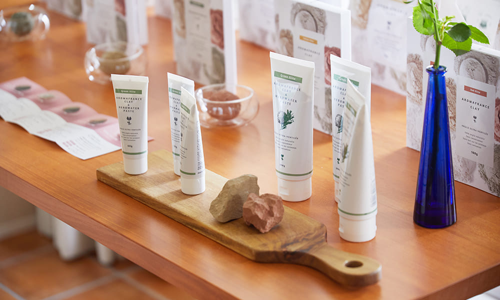 クレイやハーブウォーター、ハーブ、をはじめたした製品・ブランドの魅力を感じていただける空間で、お客様をお迎えいたします。