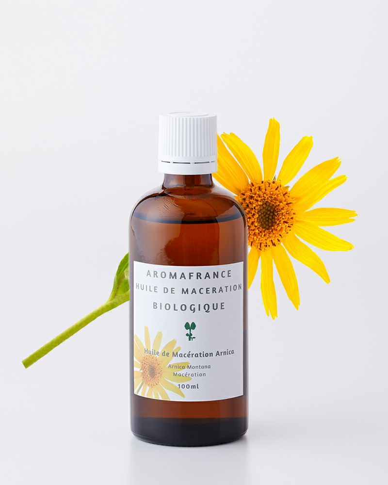 アルニカオイルとは、フランスの山地に自生するアルニカモンタナの茎の先端を、植物性ニュートラルオイル(一般的にはオリーブオイル)に浸して抽出した浸出油のことです。一か月あまり漬け込むと、茎先端にある花から、抗炎症作用、青あざ予防、鎮痛作用をもつ微量の精油、カロテノイド、植物ステロールといった有効成分が浸出します。