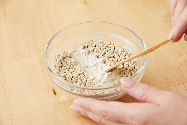 クレイペースト(エンヴェロープメント用)をボウルから指でとり、少しずつ頭皮になじませてください。(頭皮全体にクレイをなじませるのがポイントです)