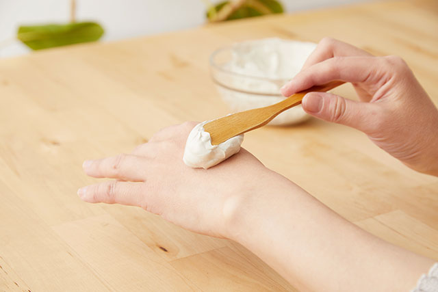 ・スパチュラにペーストを取り、肌に置いてから塗り広げていきます。